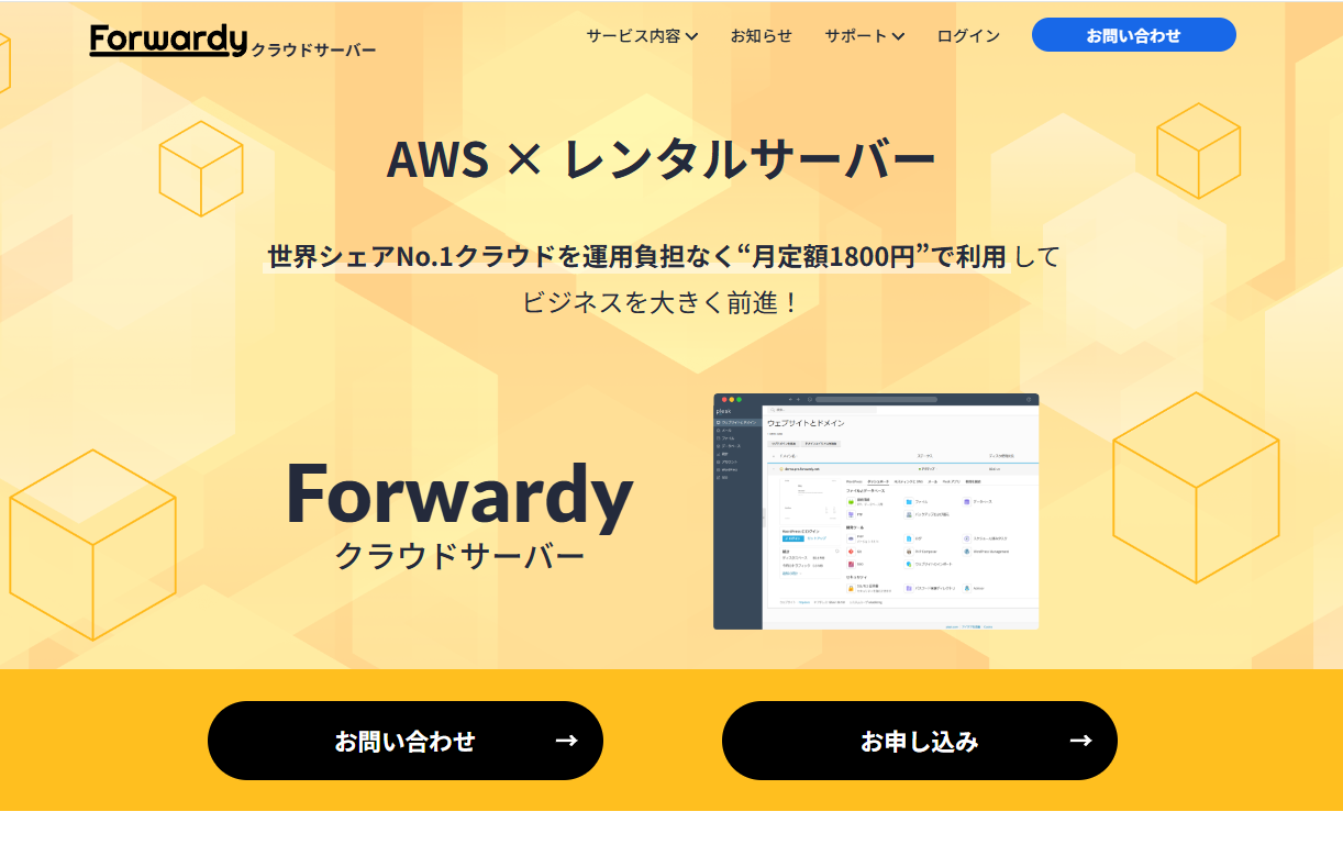| ご支援① | 当社が提供するAWSの堅牢さとレンタルサーバーの手軽さを融合したオリジナルサービス「Forwardy」のプランをOEMで活用して、自社ブランド・自社プライシングでエンドユーザー様に提供いただけるようご支援します。 | ![]() |