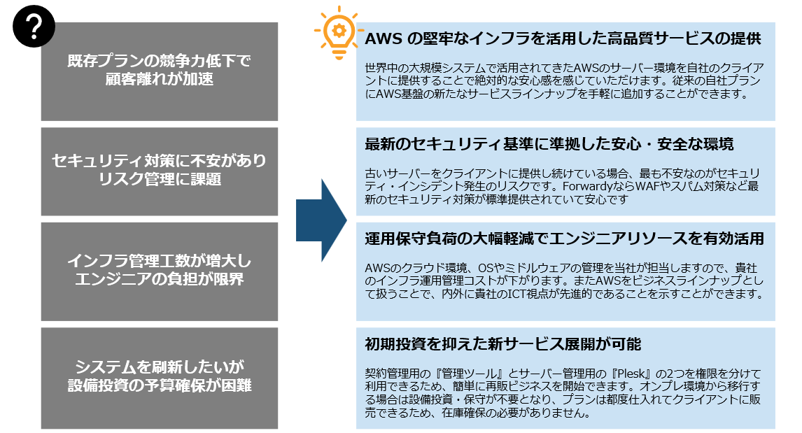 | ご支援② | 「Forwardy」をベースにしてホスティング事業者様のニーズに合わせてプランスペックやラインナップをAWS上でセミカスタマイズしてオリジナルサービスとしてご提供いただくための支援を行います。 | ![]() |