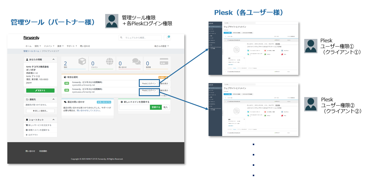 Forwardyではサーバー管理パネル「Plesk」を通じてサーバー機能の利用や操作を行い、契約管理やプラン購入、チケット問合せを「管理ツール」と呼ばれる別のシステムで提供します。