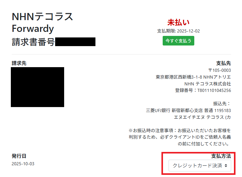 アカウントの支払い方法の設定が完了したことで、次回作成される請求書から支払方法は自動でクレジットカード決済が選択されます。