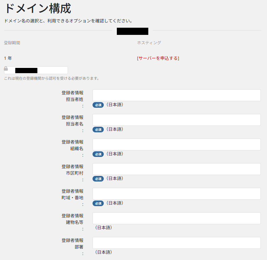 ドメインの担当者情報として下記項目を英語表記にてご入力ください。