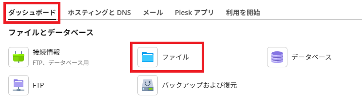 2.「ウェブサイトとドメイン」 > 対象ドメインの「ダッシュボード」 > 「ファイル」の順番にクリック