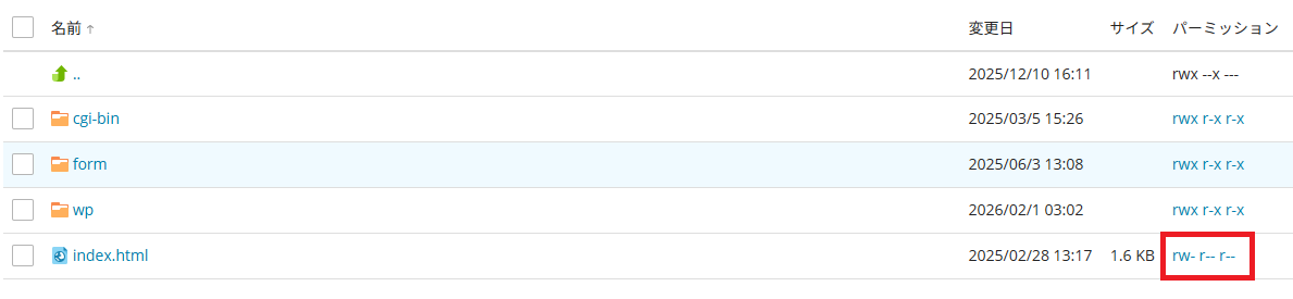 パーミッションを変更したいディレクトリやファイルのパーミッションの列の部分をクリックしてください。