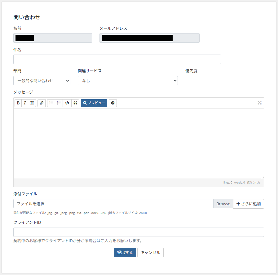 | 添付ファイル | ファイル等を送りたい場合はこちらから添付してください。 添付が可能なファイル: .jpg, .gif, .jpeg, .png, .txt, .pdf, .docx, .xlsx |